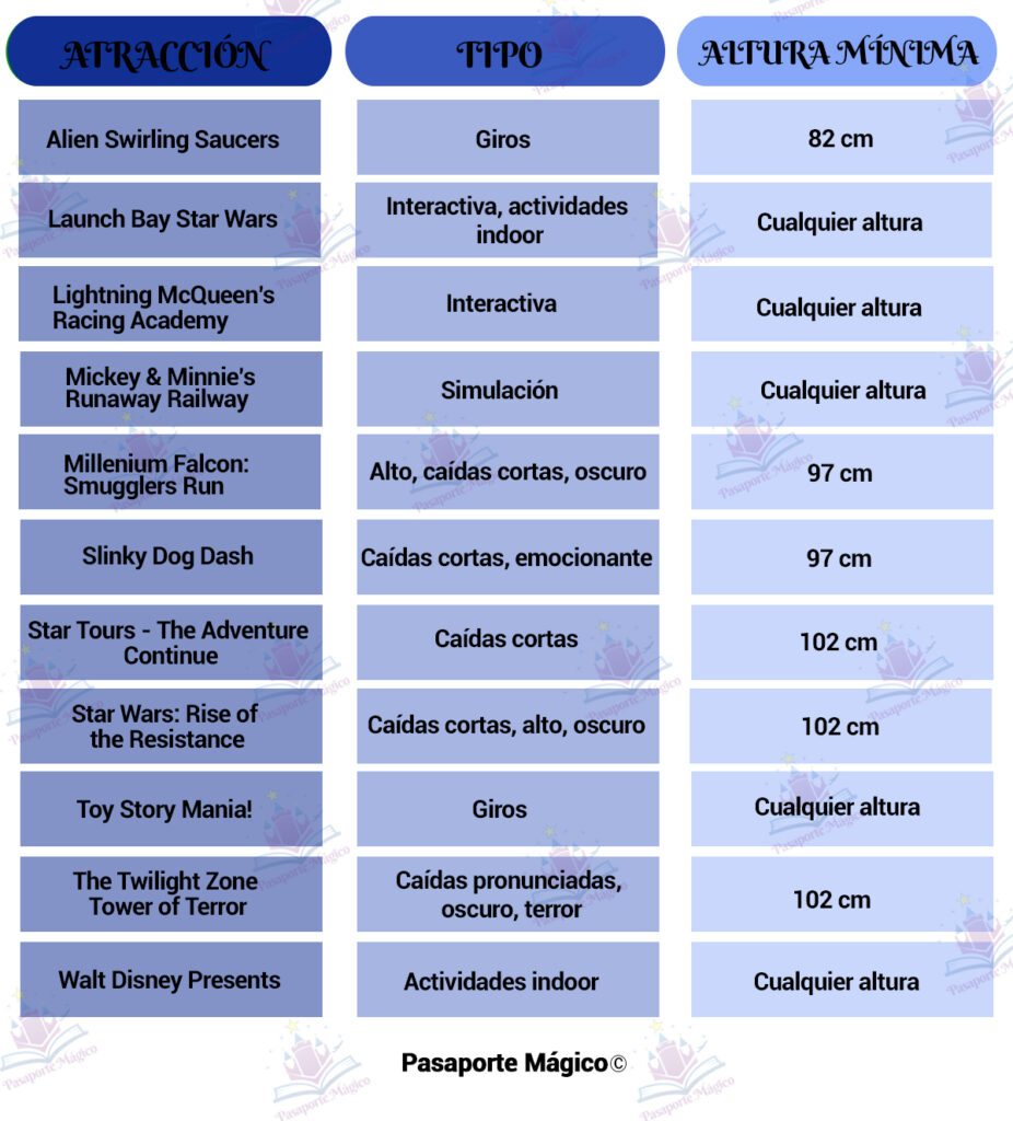 Altura mínima para cada atracción: